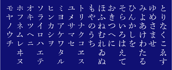 这是明治时代以后受从美国传来的字体「哥特体」的影响而制作出来的新样式的字体,于是和字字体的第三个系统从此诞生。该字体的特征是横平竖直的笔法。以片假名的「ロ」(ro)为例,横划并不往右上倾斜,而是水平的。而以横平竖直为原则制作的平假名的方法,比起由汉字部件产生的片假名要晚。虽然大部分都和汉字字体一样被称为「哥特体」(黑体),作为和字字体我建议还是称为「时样体」。